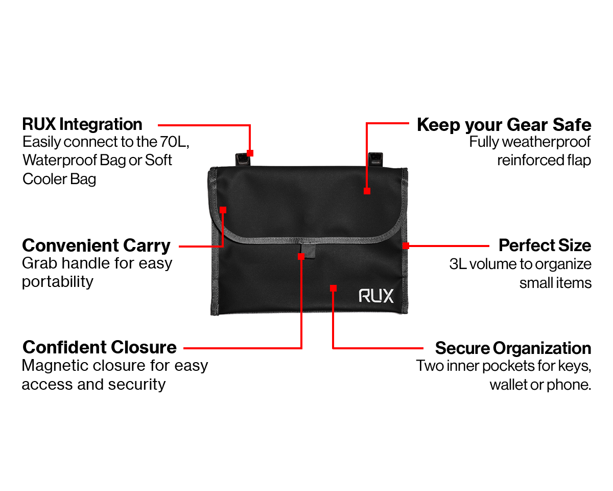 Weather resistant 3L pocket to conveniently organize small items. Connect it to your RUX 70L or Waterproof Bag, or grab it on its own and go. Super convenient for everyday carry or travel.